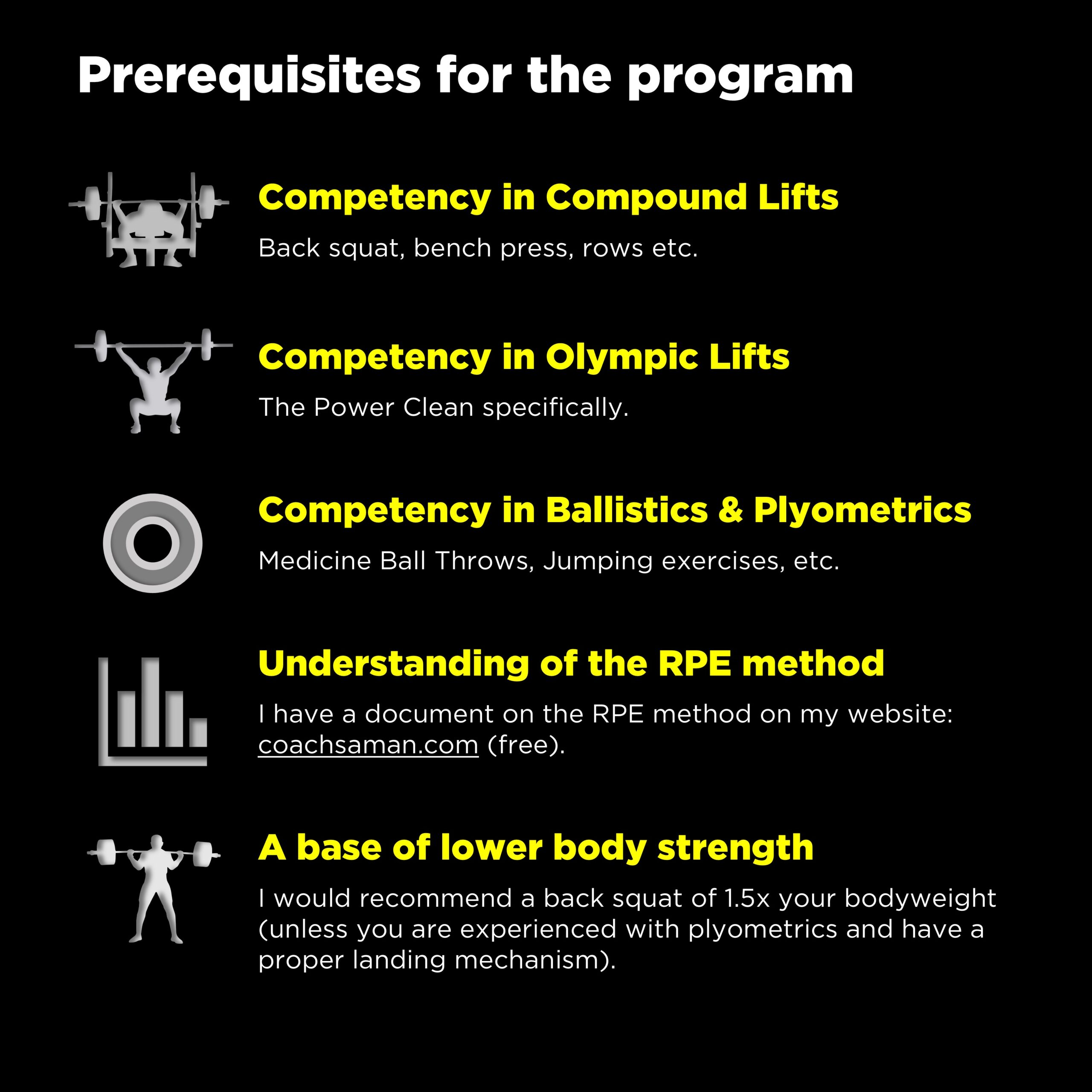 - Competency in the power clean (an Olympic weightlifting variation)