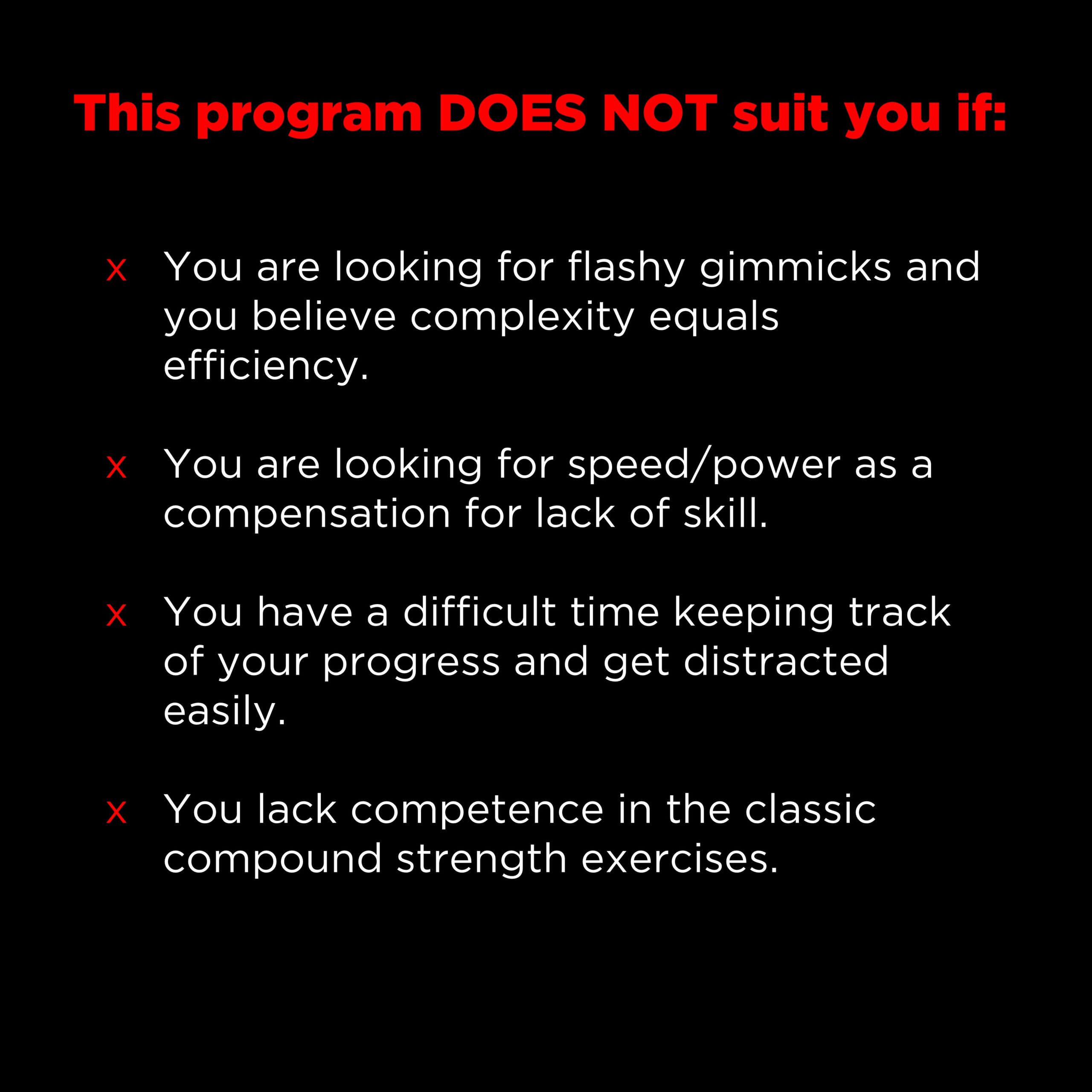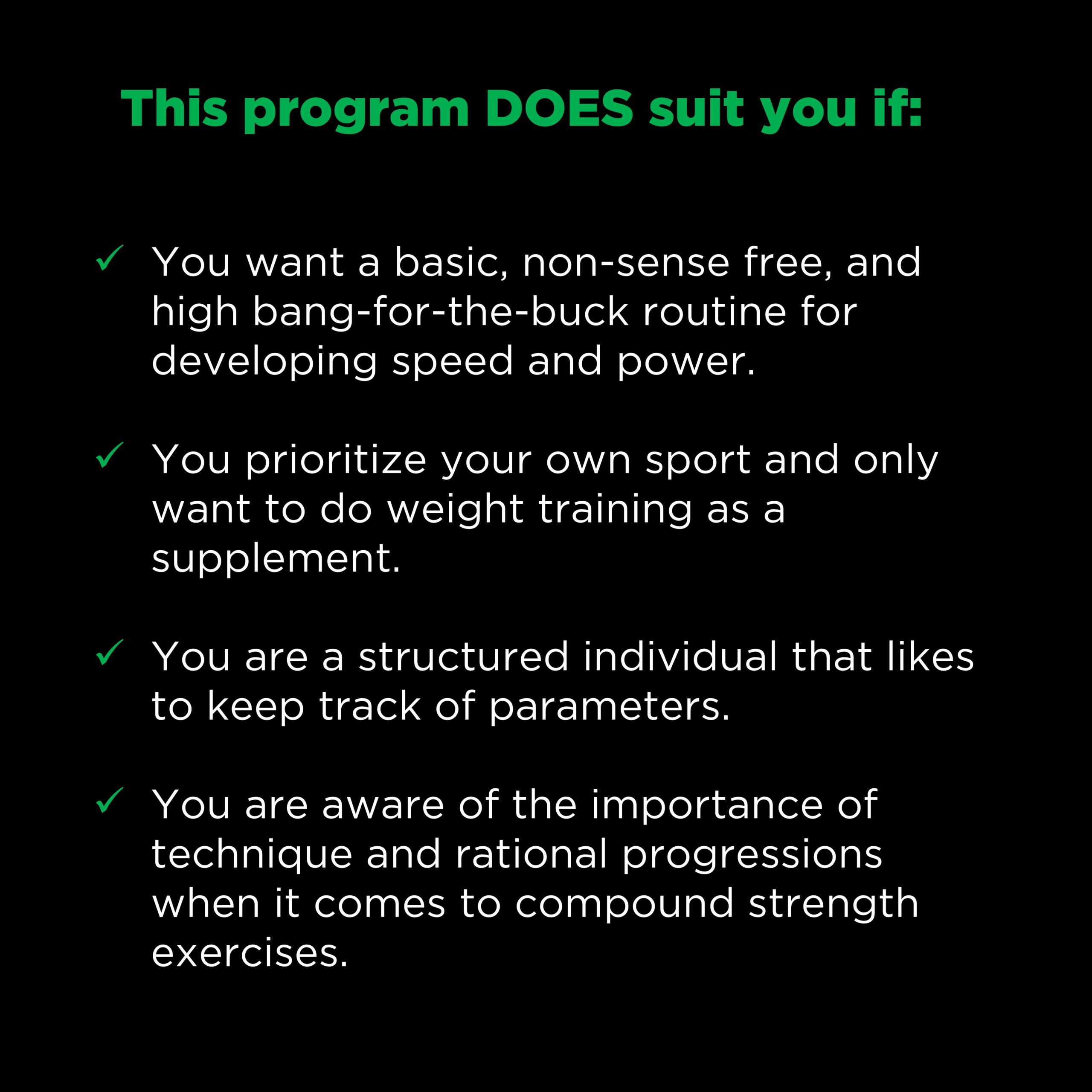 - Competency in major compound exercises, such as the back squat and bench press.