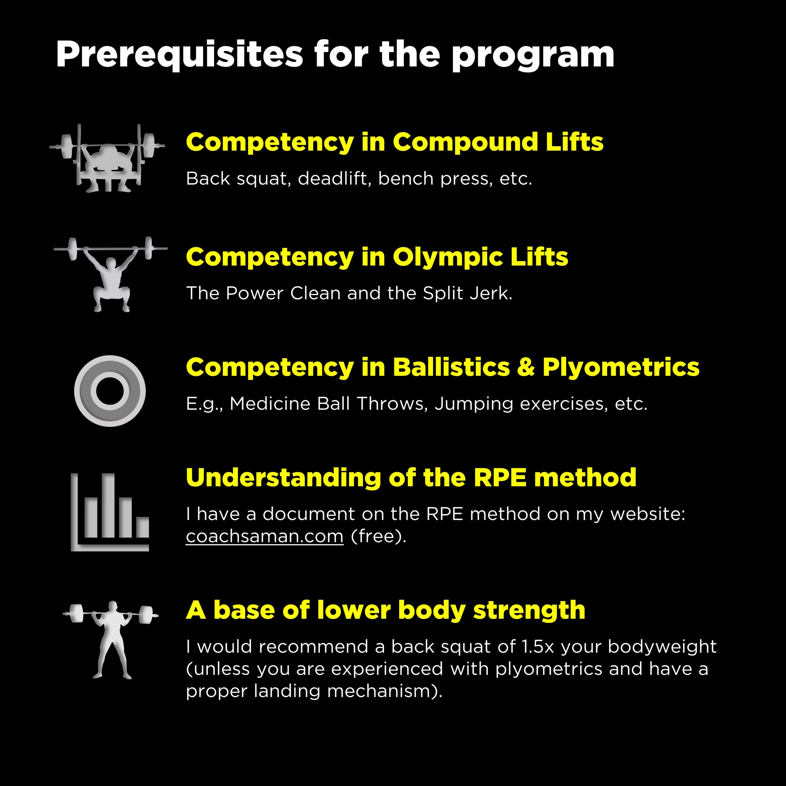 To get the most out of this program, I recommend a reliable base of lower-body strength. This is ambiguous, but on a very general basis, I would recommend a back squat of 1.5x your bodyweight, as leg and core strength are often seen as prerequisites for power exercises such as plyometrics.